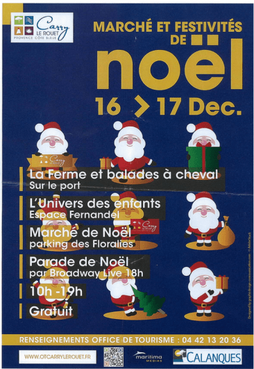 - Marché de Noël de 10h à 19h – Parking des Floralies – Une trentaine d’exposants sous tente avec des produits variés (bijoux, gastronomie, vins…) – Vin chaud offert à 18h30 par l’Association des commerçants.