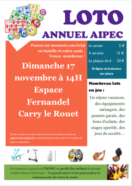 Le Loto a lieu le dimanche 17 novembre 2019 à 14H à l’ESPACE FERNANDEL à Carry le rouet.